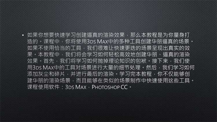 如果你想要快速学习创建逼真的渲染效果,那么本教程是为你量身打造的。课程中,你将使用3ds Max中的多种工具创建华丽逼真的场景。